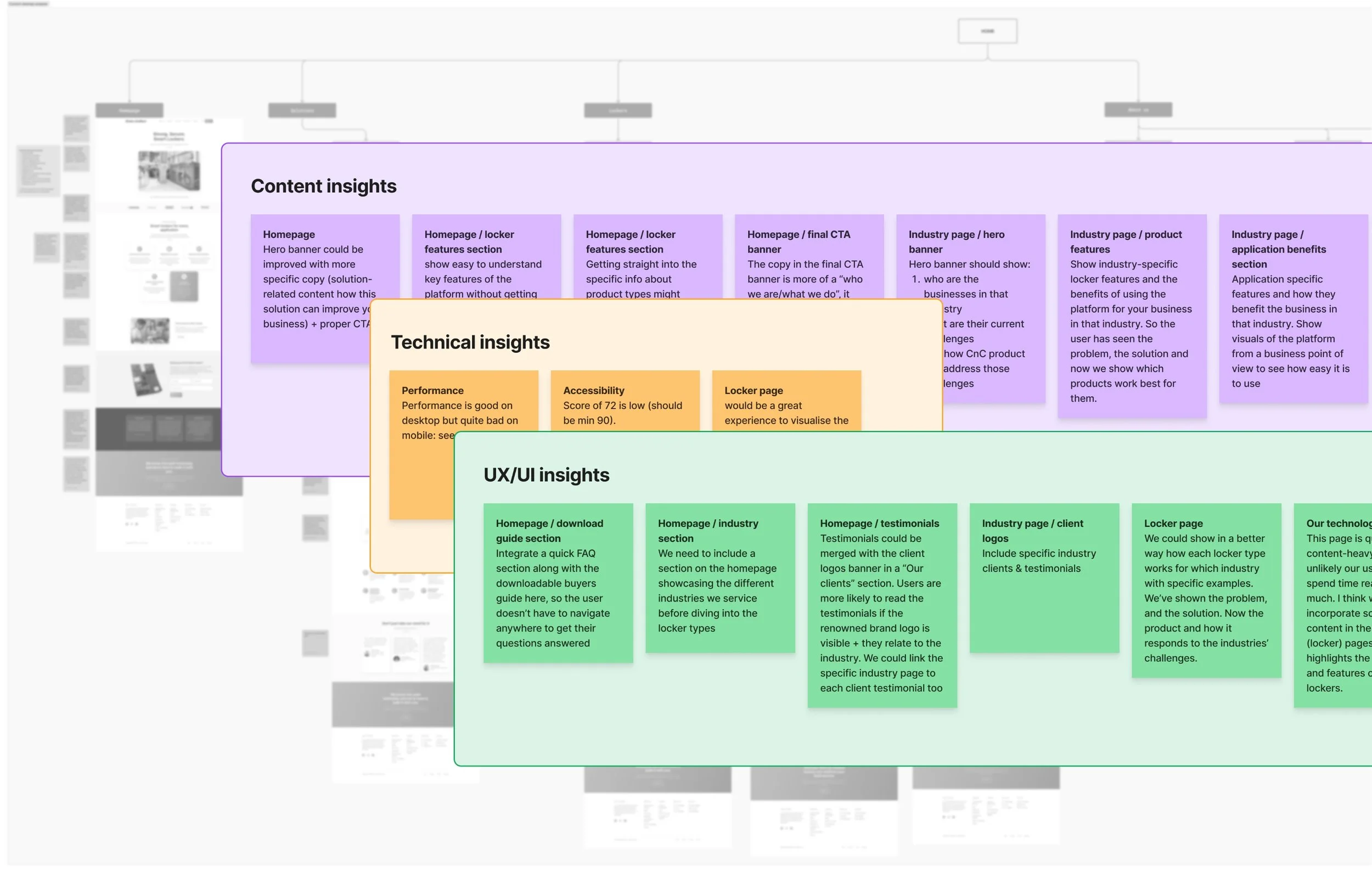 The competitor analysis I conducted studied eight of the client’s biggest competitors globally. I analysed their site-wide content structure, various user journeys, UI and overall performance, which enabled me to draw some key takeaways (what they have in common, what to avoid, things to improve etc).