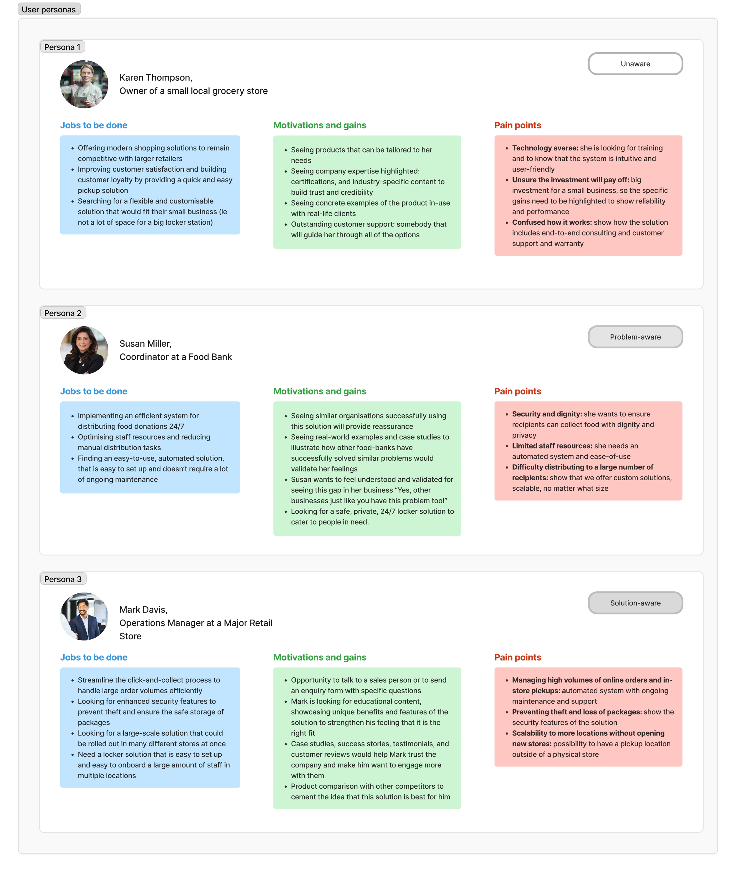 I then moved on to the user persona phase of the research, which was done based on the customer-awareness stages: unaware, solution-aware, problem-aware, product-aware, most aware.